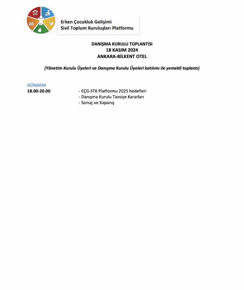 Erken Çocukluk Gelişimi Sivil Toplum Kuruluşları Platformu'nun düzenlediği Dijitalleşme ve Erken Çocukluk Gelişimi Sempozyumu 18 Kasım 2024 tarihinde Ankara Bilkent Otel'de gerçekleşmiştir. Sempozyumun program akışı ekte yer almaktadır.